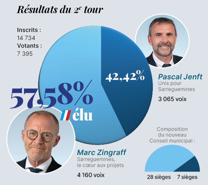 Hier soir, les habitants de Sarreguemines ont reconduit Marc Zingraff à la tête de la commune, à l’issue du second tour des élections municipales (57,58 % contre 42,42 % pour son adversaire, Pascal Jenft).