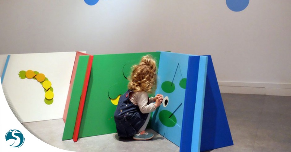 Une exposition pour les tout-petits, inspirée des albums 2 yeux ?, Après l’été et Prendre et donner (éditions Les Grandes Personnes). Ici ce sont les enfants qui font et transforment l’exposition à partir du principe tout simple des puzzles à encastrement : associations et superpositions des formes aux couleurs vives transforment l’image comme par magie. L’utilisation est simple, instinctive et entièrement basée sur la manipulation. Les pages cartonnées de ses livres ont laissé la place à de solides structures de bois à la taille des enfants. On y retrouve à la fois toute la poésie et la forme très graphique du travail de Lucie Félix. Comme dans ses livres, elle a souhaité faire de son exposition un terrain de jeu dans lequel l’enfant expérimente formes, couleurs et contrastes pour créer la surprise à chaque tableau et faire apparaître ici une poule, là un nichoir ou une grenouille... On attrape, on touche, on découvre, on apprend, on s’émerveille en s’amusant à deviner et comprendre ce drôle de jeu de cache-cache. Au fil des tableaux, l’histoire se construit tout doucement.